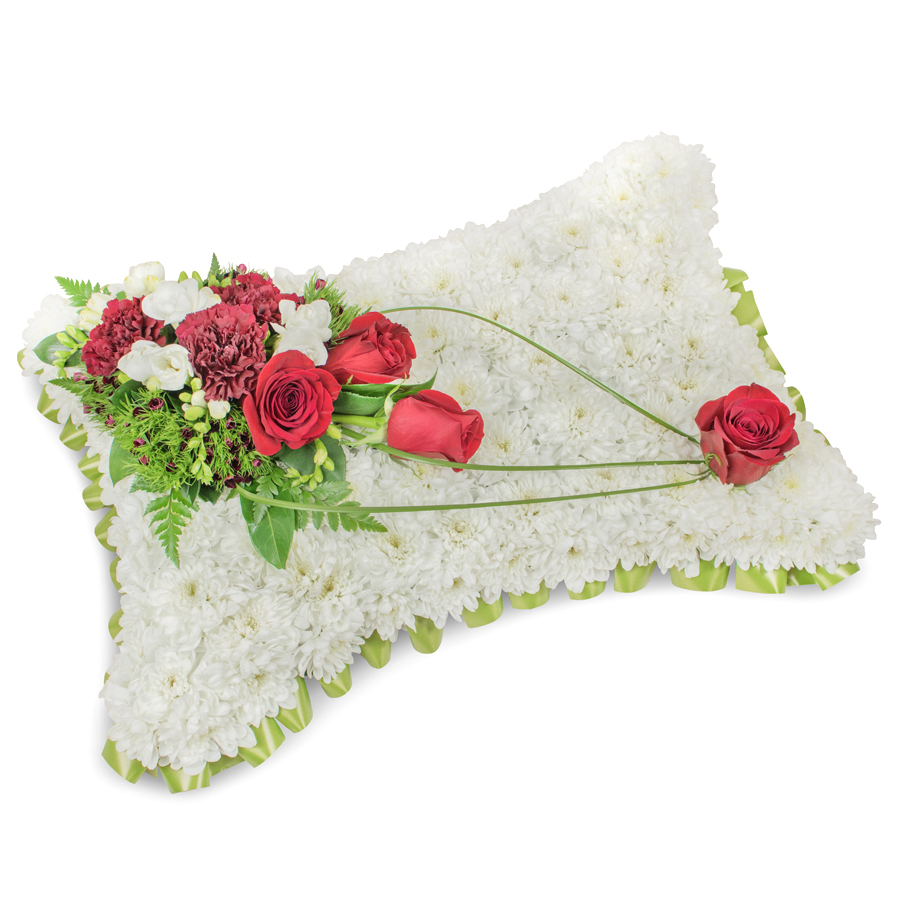 Honor cherished memories and express your heartfelt condolences with our Graceful Remembrance Bouquet. Designed to comfort and console, this arrangement features luminous white chrysanthemums, enchanting red roses, gentle white freesias, and striking dark red carnations, interspersed with dianthus and bear grass. Each bloom is meticulously hand-selected for its exceptional freshness and beauty.
